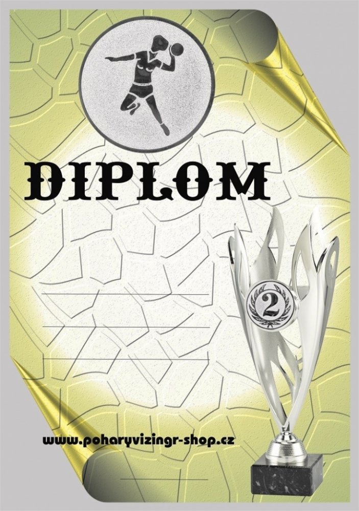 Házená č.16. Diplom formátu A4 (250 g). Objednáváte NEVYPLNĚNÉ DIPLOMY (BEZ TEXTU) a chcete si je vyplňovat vlastní tiskárnou - napište do textu "BEZ LINEK". Objednáváte diplomy VYPLNĚNÉ - krátké a stejné texty napište zde. Požadujete-li dlouhé nebo různorodé texty napište je prosím ve svém PC a vložte soubor (např.PDF,Corel,WORD,Exel apod.) před uzavřením objednávky jako přílohu (2 krok pokladna). Do diplomu lze vložit i Vaše logo, foto apod. - pro realizaci je vhodné konzultovat e-mailem v jakém formátu požadované logo máte k dispozici.Vyplněné diplomy(četná uznání, pamětní listy apod.) Vám i zalaminujeme - vhodné domluvit na prodejně. -
