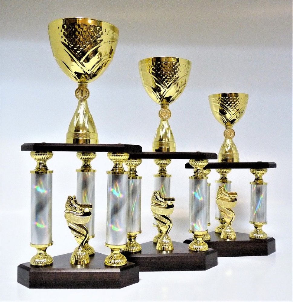 X47-P423. Dřevěné sloupkové trofeje s pořadím - viz další foto. Průměr kovových kalichů je 14-12-10 cm. Velikost trofejí je uvedena za lomítkem katalogového čísla. Objednáváte celou sadu trofejí (kat.č. X47../50/45/40cm), text na štítky napište jen do rubriky "štítek na" a do košíku zadejte 3. Ukázka možného zpracování štítků viz.další foto. Pokud objednáváte ve větším počtu a pro různé kategorie,...