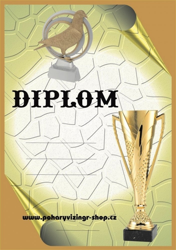 Holub č.20. Diplom formátu A4 (250 g). Objednáváte NEVYPLNĚNÉ (BEZ TEXTU) diplomy a chcete si je vyplňovat vlastní tiskárnou - napište do textu "BEZ LINEK". Objednáváte diplomy VYPLNĚNÉ - krátké a stejné texty napište zde. Požadujete-li dlouhé nebo různorodé texty napište je prosím ve svém PC a vložte soubor (např.PDF,Corel,WORD,Exel apod.) před uzavřením objednávky jako přílohu. Do diplomu lze vl...