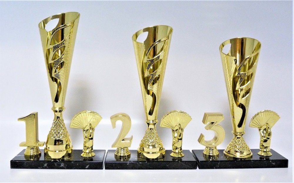 390-F45. Poháry s pořadím. Výška pohárů je uvedena za lomítkem katalogového čísla. Velikost mramorového podstavce je 20 x 9 x 2 cm. Při nákupu jedné sady (390-...-1.-2.-3.místo)- text na štítky napište jen do rubriky "štítek na" např. O POHÁR PRIMÁTORA 10.10.2021 Brno a do součtu štítků zadejte 3 !!! Ukázka možného zpracování štítku - viz. další foto. Pokud objednáváte ve větším počtu a pro různé kategorie, zpracujte texty ve Vašem PC a přiložte jako samostatný soubor k tomu určený před uzavřením objednávky(2 krok pokladna) a zde vyplňte pouze počty štítků - pro správnou kalkulaci. -
