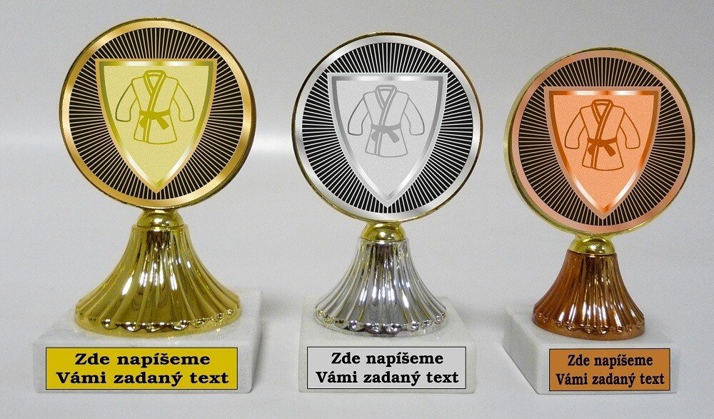 128-AFS007. Plastové plakety na mramorovém podstavci s vloženým AKRYLÁTOVÝM emblémem o průměru 7 cm. Při nákupu jedné sady plaket (128-AFS../14cm - zlato,13,5 cm - stříbro,13 cm - bronz) - text na štítky napište jen do rubriky "štítek na" a do součtu štítků zadejte 3 !!! Pokud objednáváte ve větším počtu a pro různé kategorie, zpracujte texty ve Vašem PC a přiložte jako samostatný soubor k tomu ur...