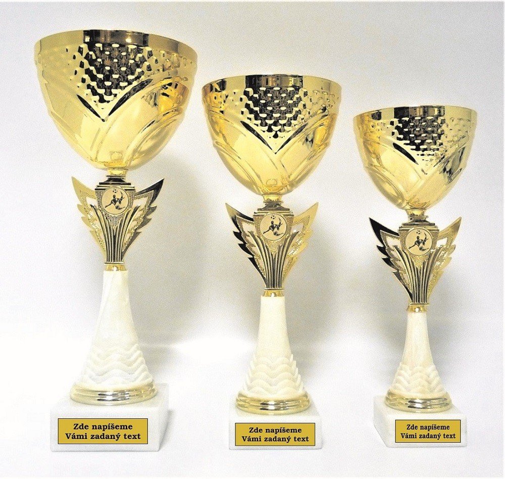 467-183. Máte zájem o jiný emblém z naší nabídky - uveďte do poznámky ZMĚNA emblému na .... a napište katalogové číslo. Průměr kalichů 16, 14, 12 cm. Velikost poháru je uvedena za lomítkem katalogového čísla. Při nákupu celé sady (467-/38/35/32cm) text na štítky napište jen do rubriky ,,štítek na" např. EVROPSKÝ POHÁR 1. - 3. místo - MUŽI 11. 11. 2026 Písek a do součtu štítků zadejte 3 !!! Objedná...