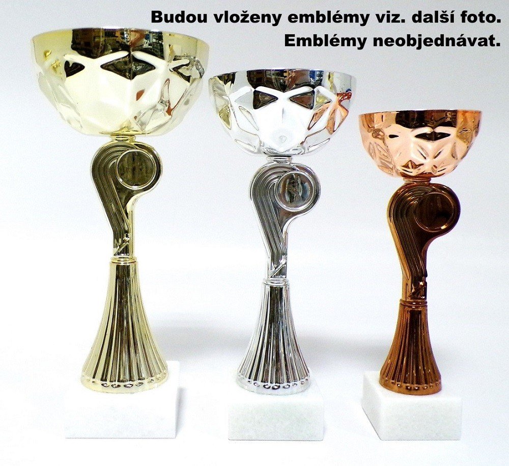 511-183. Průměr kalichů 12,10,8 cm. Emblém již v ceně. Velikost pohárů je uvedena za lomítkem katalogového čísla. Při nákupu celé sady (511/27-zlato-24-stříbro-22-bronz cm) text na štítky napište jen do rubriky ,,štítek na" a do součtu štítků zadejte 3 !!! Ukázka možného zpracování štítku viz. další foto. Objednáváte-li více pohárů a pro různé kategorie, zpracujte Váš požadavek na štítky ve svém P...