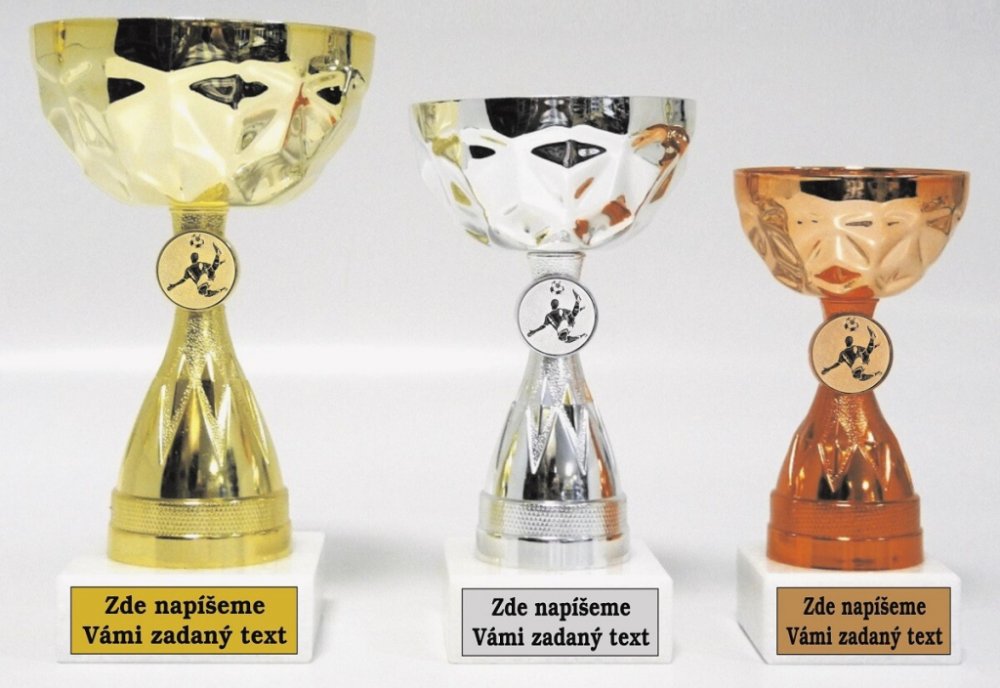 515-183. Průměr kalichů 12,10,8 cm. Velikost pohárů je uvedena za lomítkem katalogového čísla. Při nákupu celé sady (515/21-zlato-19-stříbro-17-bronz) text na štítky napište jen do rubriky ,,štítek na" a do součtu štítků zadejte 3 !!! Objednáváte-li více pohárů a pro různé kategorie, zpracujte Váš požadavek na štítky ve svém PC a soubor přiložte před uzavřením objednávky (2 krok pokladna). -