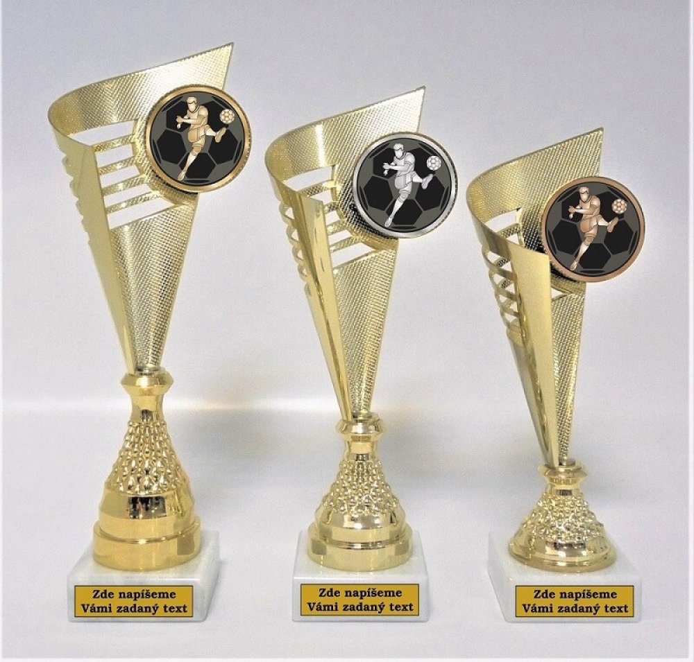 K19-AC006. Plastové poháry na mramorovém podstavci - osazené akrylátovým emblémem o průměru 7 cm z Velké Británie. Velikost pohárů je uvedena za lomítkem katalogového čísla. Při nákupu celé sady (K19-38/35/32cm), text na štítky napište jen do rubriky "štítek na" a do součtu štítků zadejte 3 !!! Pokud objednáváte ve větším počtu a pro různé kategorie, zpracujte texty ve Vašem PC a přiložte jako samostatný soubor k tomu určený před uzavřením objednávky(2 krok pokladna) a zde vyplňte pouze počty štítků - pro správnou kalkulaci. -
