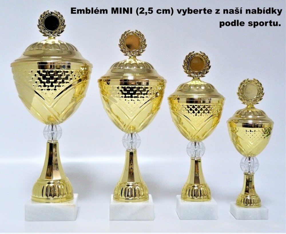 2534. Plocha na MINI emblém viz. další foto. Průměr kalichů 14, 12, 10, 8 cm. Velikost poháru včetně poklice s nosičem emblému je uvedena za lomítkem katalogového čísla. Emblémy vyberte v MENU podle sportu nebo nám zašlete Vaše logo. Při nákupu celé sady (2534/35-33-29-25cm) text na štítky napište jen do rubriky "štítek na" a do součtu štítků zadejte 4 !!! Ukázka možného zpracování štítků viz. dal...