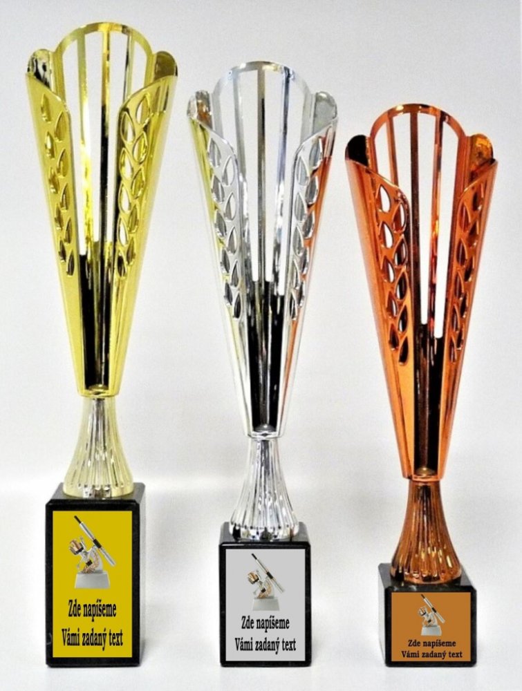502-K1141. Plastové poháry na mramorovém podstavci. Velikost pohárů ZLATO-STŘÍBRO-BRONZ je uvedena za lomítkem katalogového čísla. Při nákupu celé sady (502-...39/37/35cm), text na štítky napište jen do rubriky "štítek na" a do součtu štítků zadejte 3 !!! Pokud objednáváte ve větším počtu a pro různé kategorie, zpracujte texty ve Vašem PC a přiložte jako samostatný soubor k tomu určený před uzavřením objednávky(2 krok pokladna) a zde vyplňte pouze počty štítků - pro správnou kalkulaci. -