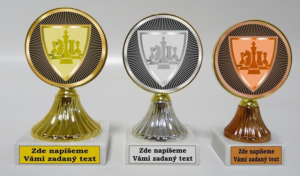 128-AFS042. Plastové plakety na mramorovém podstavci s vloženým AKRYLÁTOVÝM emblémem o průměru 7 cm. Při nákupu jedné sady plaket (128-AFS../14cm - zlato,13,5 cm - stříbro,13 cm - bronz) - text na štítky napište jen do rubriky "štítek na" a do součtu štítků zadejte 3 !!! Pokud objednáváte ve větším počtu a pro různé kategorie, zpracujte texty ve Vašem PC a přiložte jako samostatný soubor k tomu ur...