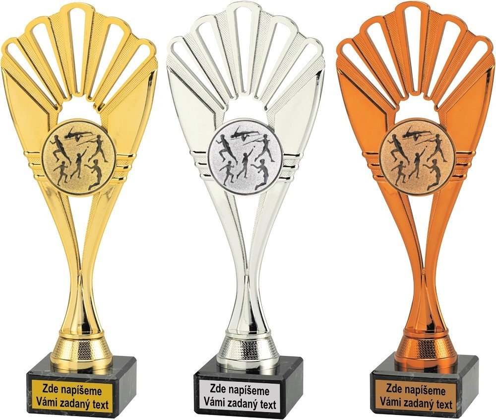 ET468-6. Velikost trofejí je 28 cm včetně mramorového podstavce. Pokud Vám vložený emblém nevyhovuje, lze jej nahradit jiným MAXI emblémem z naší nabídky - stačí jen do poznámky (druhý krok pokladny) napsat - změna emblému na - a napsat výrobní číslo. Při nákupu jedné sady trofejí (zlato-stříbro-bronz) - text na štítek napište jen do rubriky "štítek na" např. MISTROVSTVÍ ČR Plzeň 5. 9 . 2026 a do součtu štítků zadejte 3 !!! Pokud objednáváte ve větším počtu a pro různé kategorie, zpracujte texty ve Vašem PC a přiložte jako samostatný soubor k tomu určený před uzavřením objednávky (2 krok pokladna) a zde vyplňte pouze počty štítků - pro správnou kalkulaci. -
