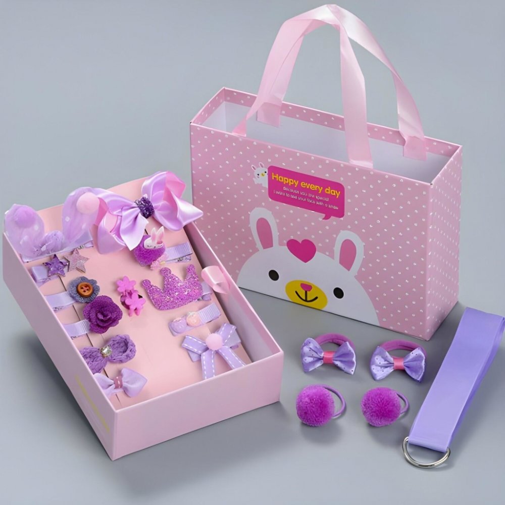 Dětské gumičky do vlasů jsou vhodné na tvorbu účesů. V balení je 18ks různých sponek a gumiček. Balené jsou v milém dětském kufříku.