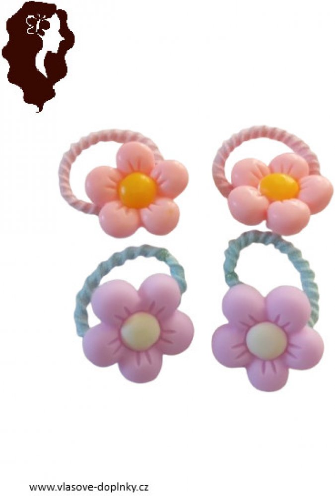 Drobné gumičky zdobené plastovou květinkou. V sadě po čtyřech kusech.