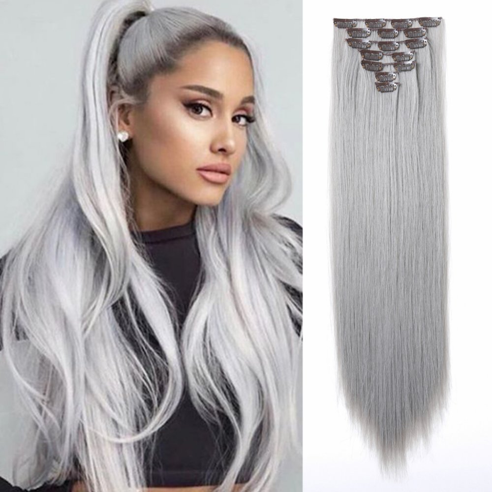 Vlasy clip in 7 pásů - leskle šedé příčesky rovné 50 cm