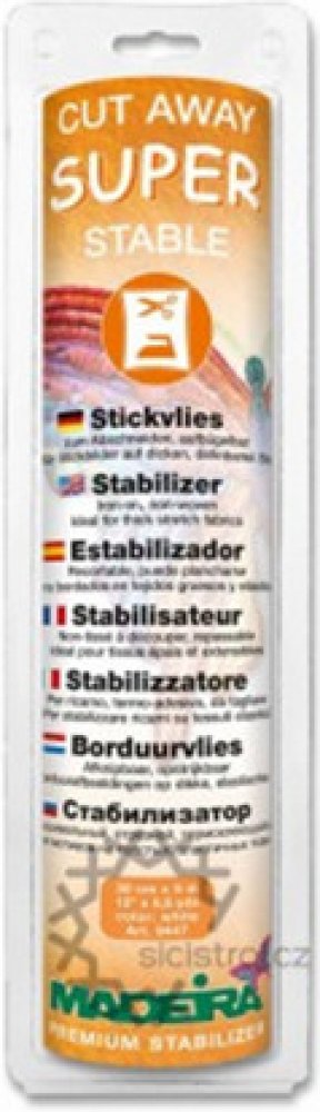 Vlizelín - Super stable bílý nažehlovací - Madeira (30cm x 5m) Nažehlovací fólie bílé barvy je ideální pro všechny vyšívací práce prováděné na stroji. Látka se nažehlením fixuje a následně je vyšívána společně s vlizelínem Super stable, a to aniž by klouzala. Vlizelín je vhodný jako podkladový materiál pro vyšívání na silné nebo pružné materiály. Můžete jej využít i k výstuze při šití tašek nebo t...