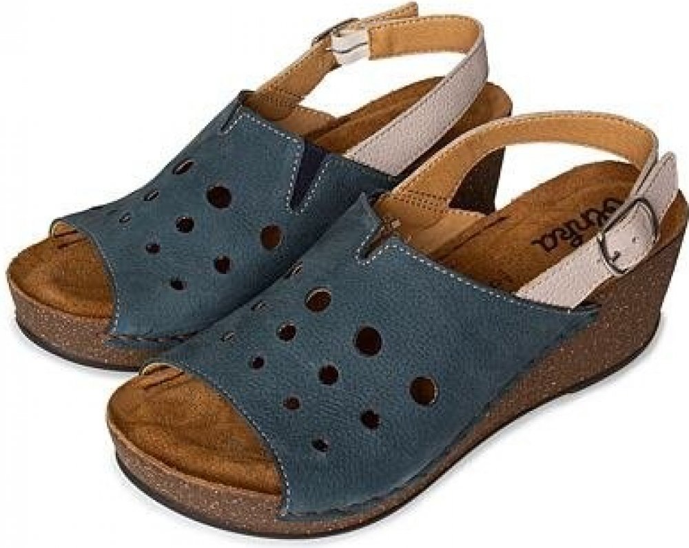 Celokožené sandály Valerie mají podešev z odolné, ale měkké směsi korku a gumy, který pomáhá tlumit nárazy při došlapu a snižuje tak tlak na klouby. Kulaté otvory ve svršku jsou nejen stylovou ozdobou boty, oceníte je i jako příjemné větrání během teplých letních dnů. Kožený svršek má na boku gumičku, díky které se bota lépe přizpůsobí výšce nártu a pohybu nohy při chůzi. Pásek okolo kotníku si nastavíte pomocí přezky podle své potřeby. Měkká kožená stélka je příjemná i na dlouhé nošení, a zvýšená pata pomáhá držet celé tělo ve vzpřímené pozici. Materiál: Svršek, stélka: kůže Podrážka: korek, guma Výška podpatku: 6 cm