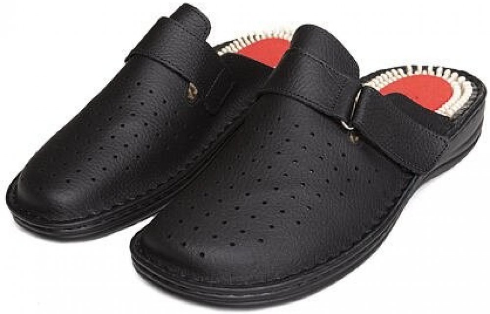 Nazouváky, které díky speciálně tvarované stélce masírují chodidla při každém kroku, pomohou ulevit od bolestí po dlouhém dni na nohou, a také bolestem předcházet. Kožený svršek si pomocí suchého zipu nastavíte přesně jak potřebujete, a zbytek práce odvedou masážní body na stélce pantoflí. Stimulace nervových zakončení jemnou masáží pomáhá lepšímu proudění krve v nohách, což je pro naše zdraví velmi prospěšné. Dobré prokrvení brání pocitu těžkých nohou, jejich bolesti a únavě, a pomáhá předcházet otokům. V oblasti stélky, které nesou největší část váhy těla, je měkká pěna bez masážních bodů. Stélka je oboustranná, můžete ji tedy otočit a hladkou stélku používat jako u běžných nazouváků. Celá stélka je vyjímatelná, dá se tedy nahradit vlastní speciální stélkou. Materiál: Svršek: kůže Stélka: guma, pěna Podešev: guma