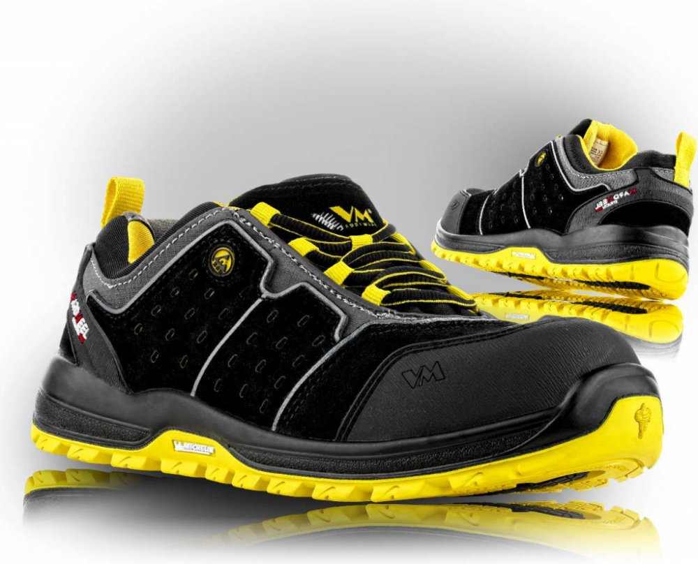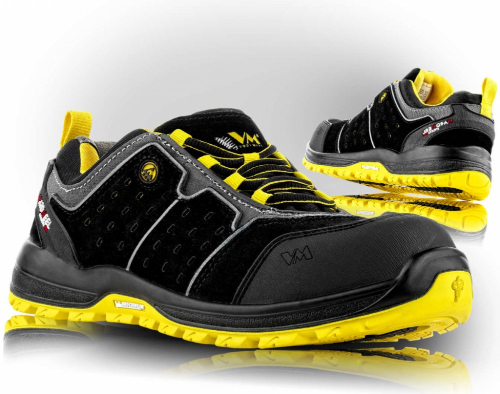 Polobotka bezpečnostní ESD - celokožená, NON METALIC. Svršek: broušená hovězinová useň VELUR v tloušťce 1,7 - 1,9 mm, podšívka: SOFT-LINNER - stretchová, prodyšná s absorpční schopností, vkládací stélka: HI-POLY - anatomicky tvarovaná z lehčené polyuretanové pěny potažená textilií MESH, antistatická, podešev: MICHELIN-PU/RUBBER - olejivzdorná, antistatická, protiskluzová. Norma ČSN EN ISO 20345:20...