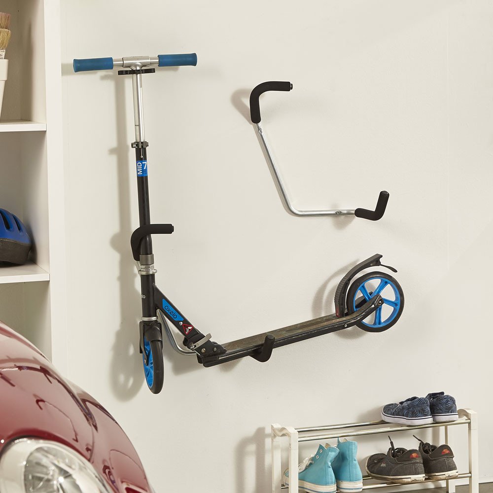 nástěnný držák umožňuje jednoduché skladování - koloběžka se zavěsí na držák