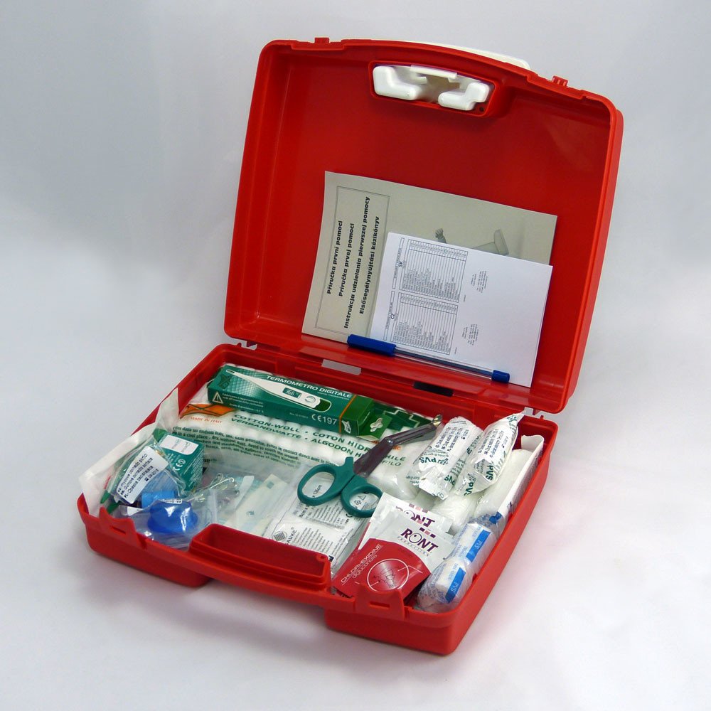 plastový kufr první pomoci malý je vyroben z polypropylenusoučástí kufru je i stěnový držák se šrouby, který lze připevnit pevně ke zdi - na tento držák lze kufr pevně připevnit a stává se z něj klasická lékárničkav případě potřeby lze kufr jednoduše ze stěnového držáku vyjmout a přenést přímo na místo úrazukufr první pomoci malý je bez vnitřního děleníkufřík první pomoci malý KP 2 je vybaven náplní STANDARD, která vyhovuje požadavkům pro vybavení lékárničky v domácnostech, menších firmách nebo organizacích s běžnou mírou rizika, např. kanceláře, rekreační sportovní zařízení, hotely atd.náplň do lékárničky STANDARD obsahuje základní sortiment obvazového materiálu včetně latexových rukavic a nůžekdále je také vybavou náplně STANDARD elastické obinadlo a sterilní krytí použitelné kupříkladu na menší popáleniny. Obsah náplně STANDARD - STDObvaz 7 cm x 3,5 m2 ksObvaz hotový sterilní č. 31 ksObvaz hotový sterilní č. 41 ksObvaz elastický 10 cm x 4 m1 ksPryžové obinadlo škrtící1 ksSterilní krytí 5 x 5 cm1 ksSterilní krytí 7,5 x 7,5 cm2 ksSterilní krytí 10 x 10 cm1 ksNáplasti s polštářkem 6 x 10 cm8 ksNáplast fixační 2,5 cm x 5 m1 ksPinzeta sterilní1 ksRouška resuscitační1 ksTrojcípý šátek1 ksRukavice vyšetřovací 2 páryDigitální teploměr1 ksNůžky1 ksVata 50 g.1 ksDesinfekční utěrka5 ksŠpendlíky zavírací - nerez12 ksPříručka první pomoci1 ksKniha úrazů1 ksTužka1 ksBarva:ČervenáRozměry:320 x 280 x 119 mmMateriál:PlastZáchranářský kufřík:Ano