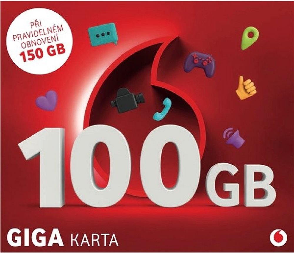 Vodafone GIGA karta nabízí balíček 100 GB dat na 30 dní za cenu 449 Kč. Balíček se automaticky obnoví při dostatečném kreditu s prvním připojením k internetu. Pokud budete balíček pravidelně obnovovat nejpozději do 3 dnů po jeho vypršení, získáte při další obnově navýšený objem 150 GB dat za stejnou cenu 449 Kč. Pokud balíček nebude aktivován déle než 3 dny, při další aktivaci obdržíte základní ob...