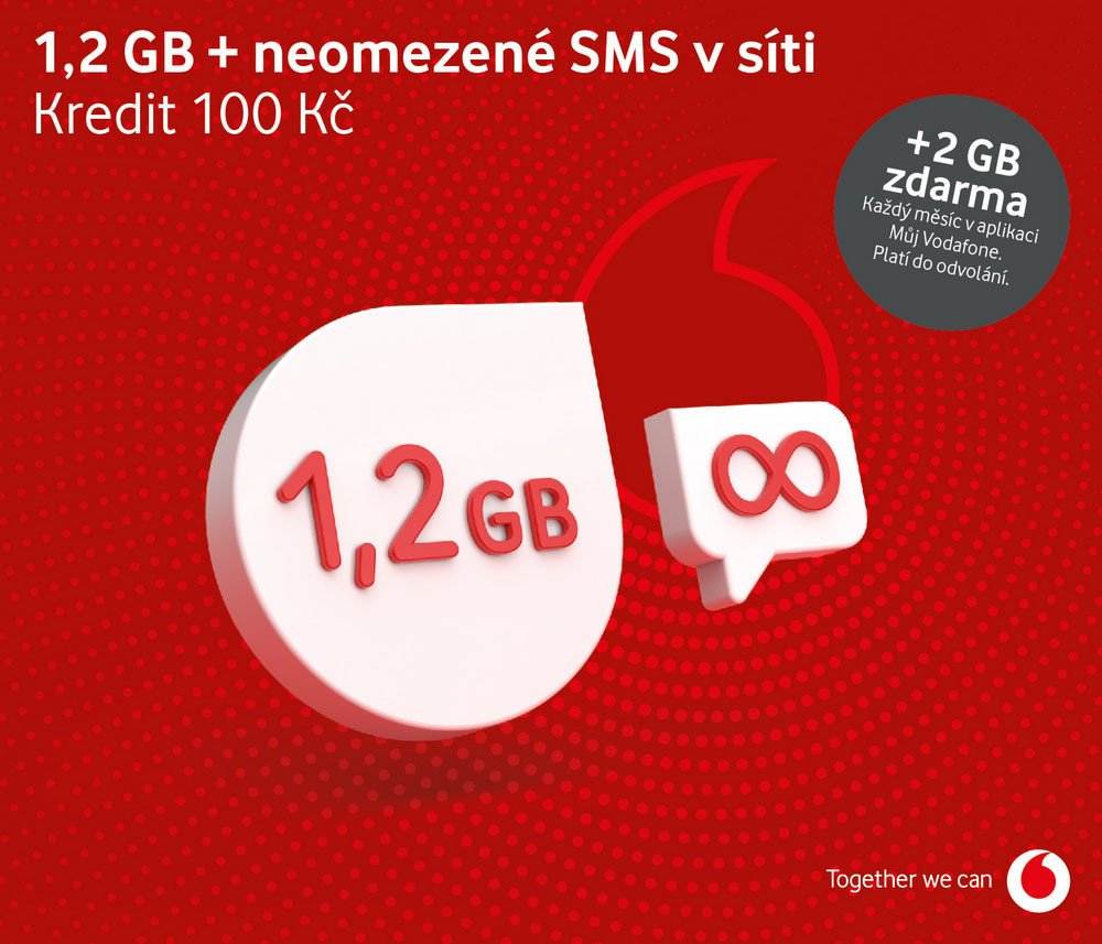 Balíček ke kartě s 3,5 GB dat a neomezenými SMS v síti Vodafonu na první měsíc v ceně. Na SIM kartě můžete aktivovat další výhodné balíčky na volání, SMS a data. Více informací o balíčcích a jak je aktivovat na získáte na vodafone.cz/balicky.