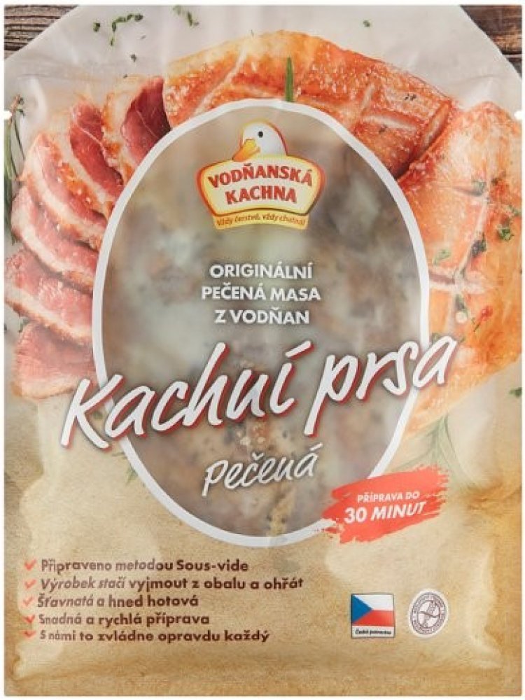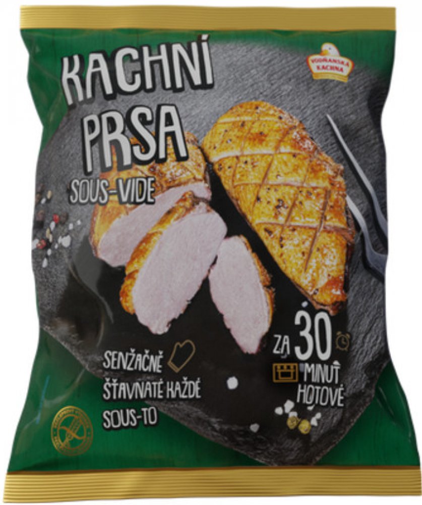 -- Dva kusy kachních prsíček s kůží, bez kosti, tepelně opracované moderní metodou sous vide, zabalené ve vakuu spolu s výpekem, který obsahuje šťávu a tuk z masa.