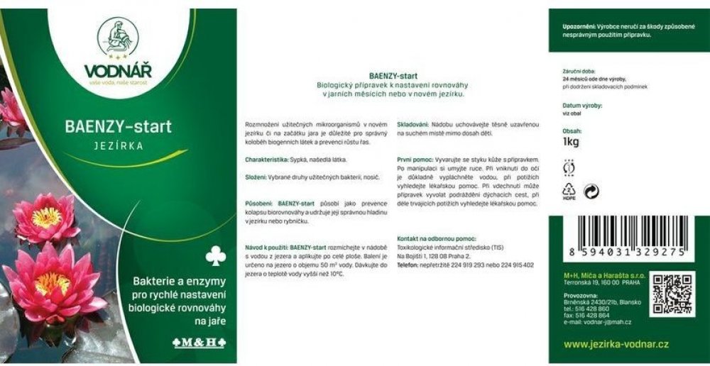 Použití: BAENZY - Start rozmíchejte v nádobě s vodou z jezírka a aplikujte v celé ploše.