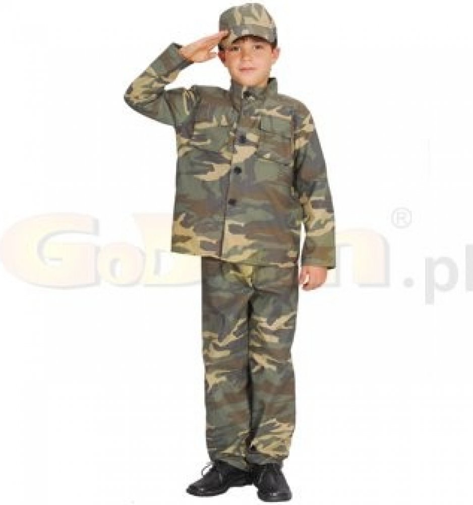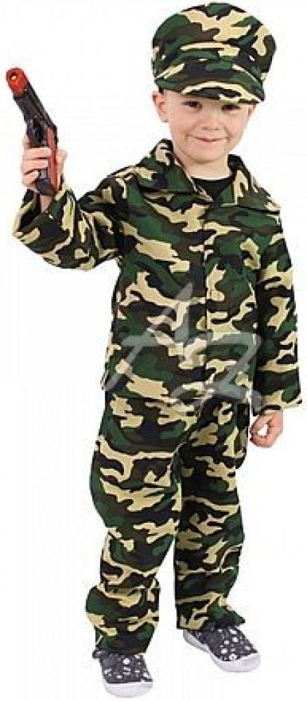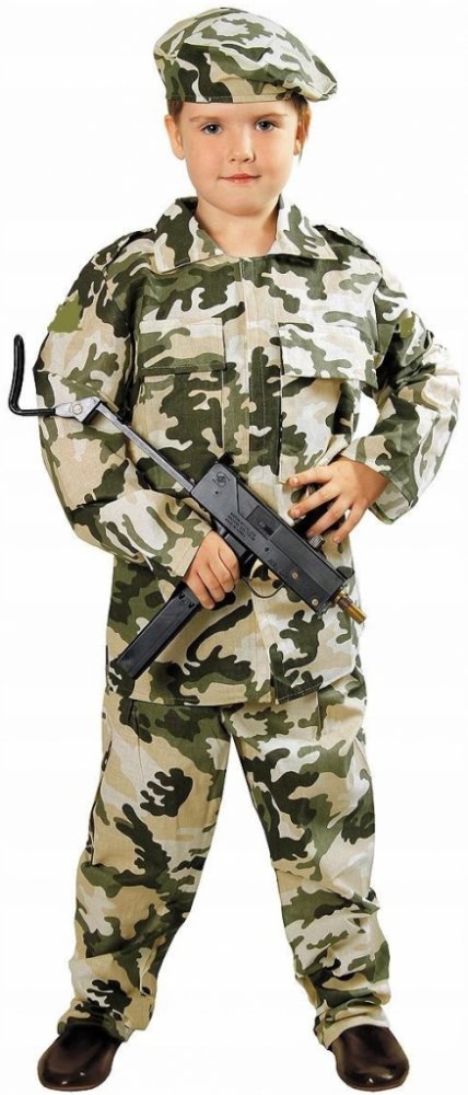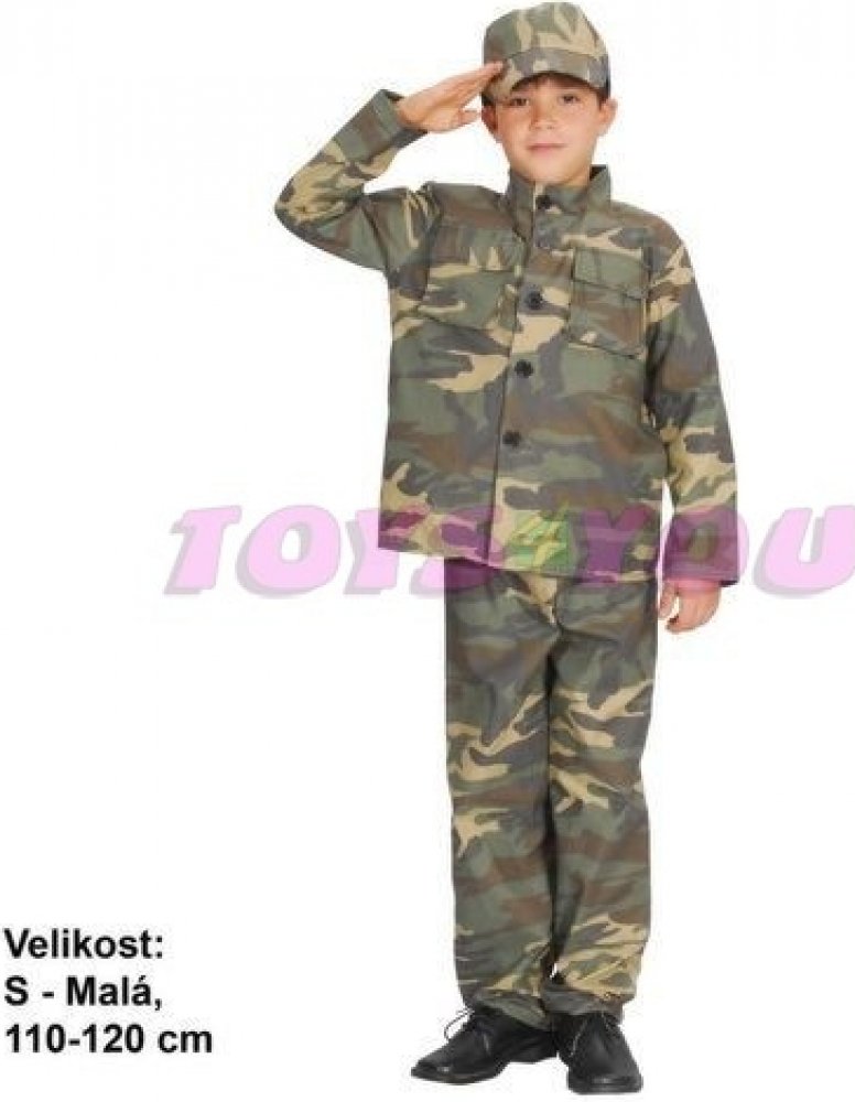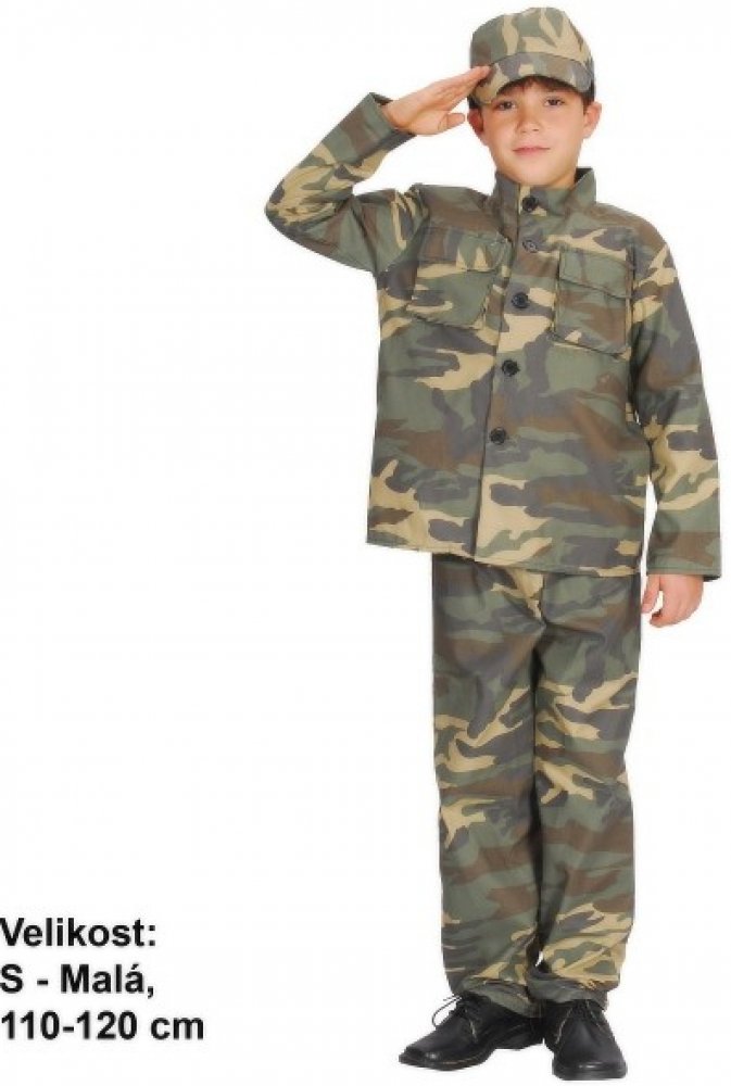Karnevalový kostým. Voják je kostým vojáka, který vykouzlí z každého malého chlapce vojáka během chvilky. Maskáčové kalhoty, čepice a bunda - to je kostým vojáka! Kostým je vhodný na dětské párty a oslavy, na karneval nebo maškarní ples. Kostým je vhodný pro chlapce ve věku 4 - 6 let. Velikost: 110 - 120cm
