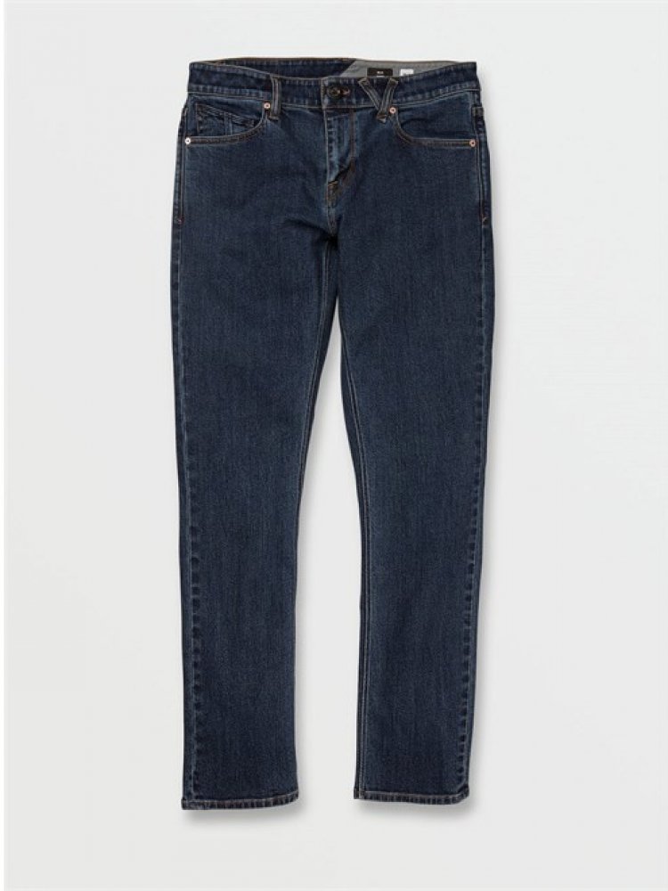 Pánské džíny v nejužším skinny střihu. Úzké 14" nohavice, elastické provedení materiálu. Přední zapínání na zip, klasický 5-ti kapsový střih. Pánské kalhoty Volcom 2X4 Denim dirty med blue Velikost 33/32 z kategorie Volcom .
