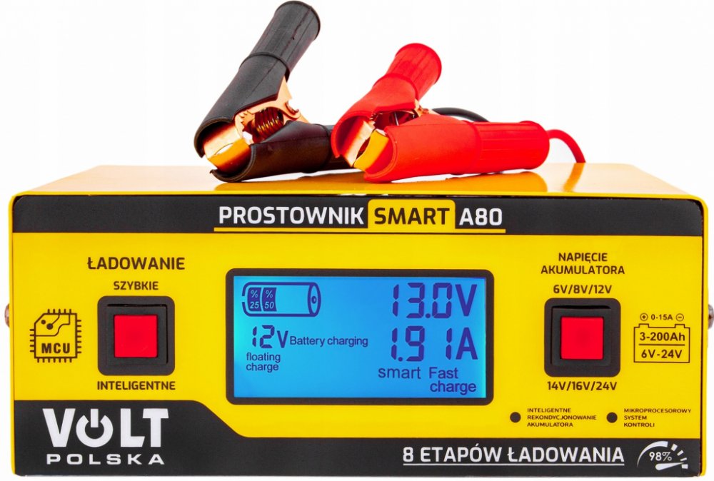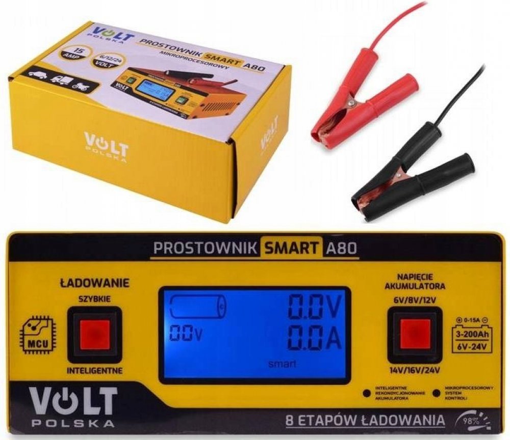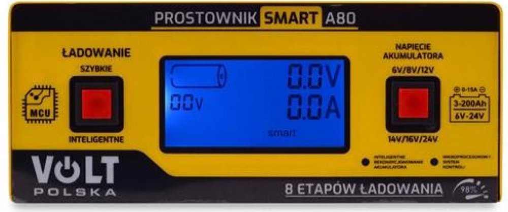 Usměrňovač SMART 6V/12V/24V 15A A80 značky VOLT Polska je první nabíječka baterií na trhu s mikroprocesorovým systémem kontroly a řízení s technologií PWM s možností nabíjení baterií až do 24 V a možností výběru nestandardních typů napětí baterií,která inteligentně a konkrétně vybere vhodné parametry a zajistí,že váš vybitý a zanedbaný akumulátor bude regenerován.