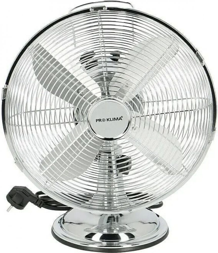 Tento oscilační stolní ventilátor PROKLIMA s atraktivní povrchovou úpravou Retro Chrom Finish je vybaven lopatkami o velkém průměru, které přispívají k vysoké hodnotě průtokového množství vzduchu. Spojuje funkčnost, design a výkon v jednom výrobku. Přístroj je vybaven stabilním kruhovým podstavcem zaručujícím vysokou stabilitu. Navíc je vybaven 3 rychlostmi a lze individuálně nastavit jeho úhel sklonu. Jedná se o kovový oscilační přístroj, to znamená, že hlava ventilátoru se pohybuje v nekonečné smyčce zleva doprava a zpět. Oscilační pohyb lze také deaktivovat prostřednictvím zajišťovacího kolíku v zadní části hlavy rotoru. Díky tomu se tento efektivní ventilátor skvěle hodí na psací stoly v kancelářích nebo v obytných prostorech, vždy tam, kde je zapotřebí jeho příjemně chladivého účinku.