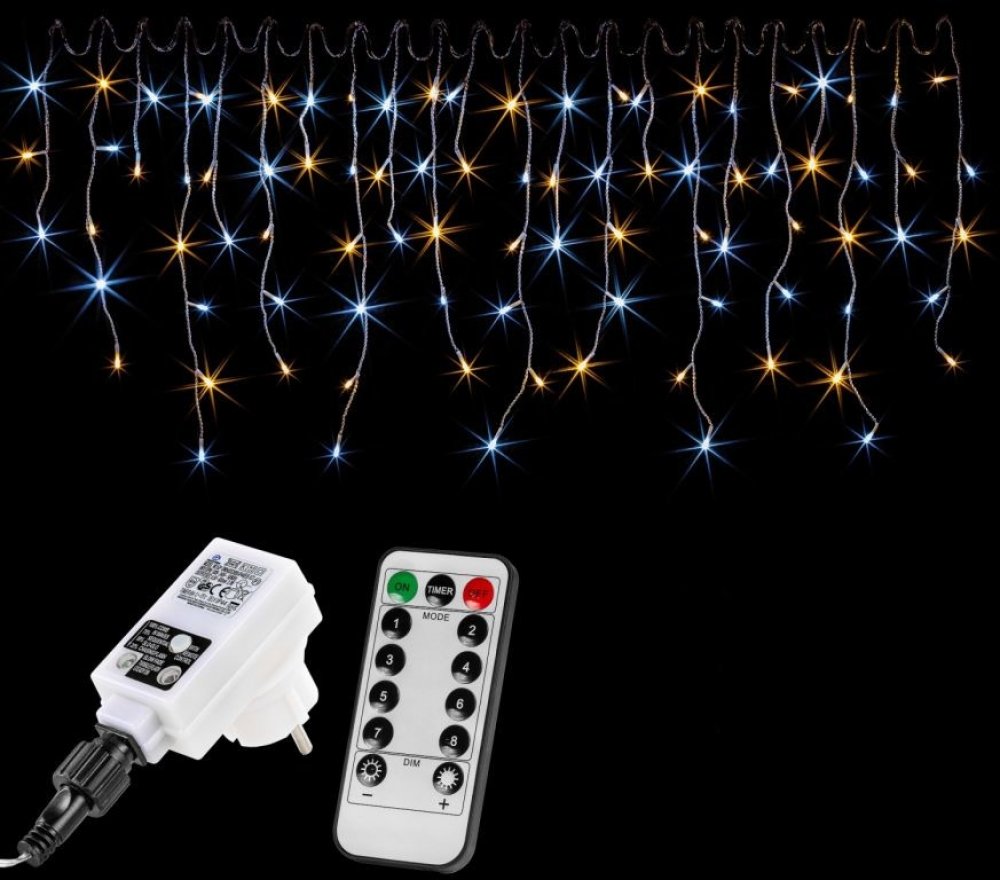 Toto osvětlení je na dálkové ovládání (baterie není součástí balení), kterým je možné nastavit až 8 programů svícení - 1. kombinace programů, 2. svícení ve vlnách, 3. sekvenční svícení, 4. pomalé záření, 5. rychlé blikání, 6. pomalé mizení světla, 7. jiskřivé blikání, 8. trvalé svícení. Dále je zde funkce časovače s kontrolkou, který zaručuje 6 hodin svícení a poté se řetěz na 18 hodin vypne. Čas...