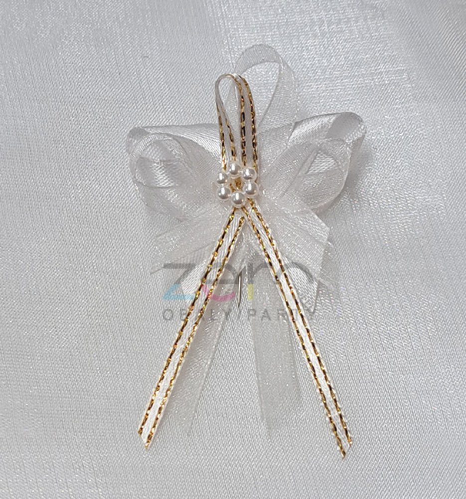 Vonička pro rodiče a svědky o výšce 8 cm. Součástí je i špendlík na přichycení.Barva: bílá atlasová + bílá se zlatými pruhy atlasová + bílá šifónová a bílým perlovým květem