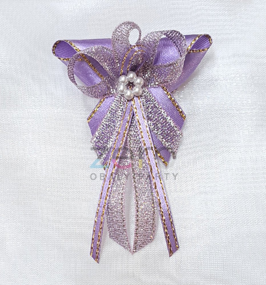 Vonička pro rodiče a svědky o výšce 8 cm. Součástí je i špendlík na přichycení.Barva: fialová se zlatými pruhy atlasová + fialová lurexová s bílým perlovým květem