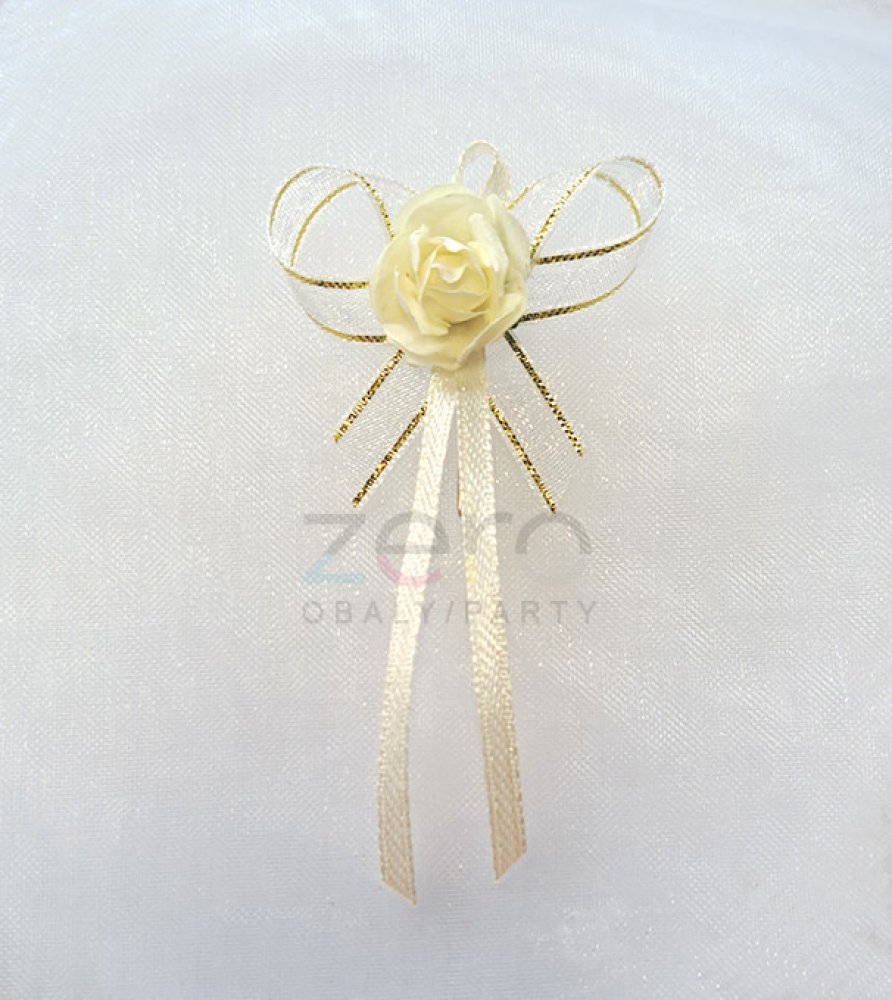Vonička (vývazek) svatební pro svatebčany o šířce 5 cm a výšce 8 cm. Součástí je i špendlík na přichycení:Barva: krémová se zlatou nitkou šifónová + krémová atlasová + krémová růžička
