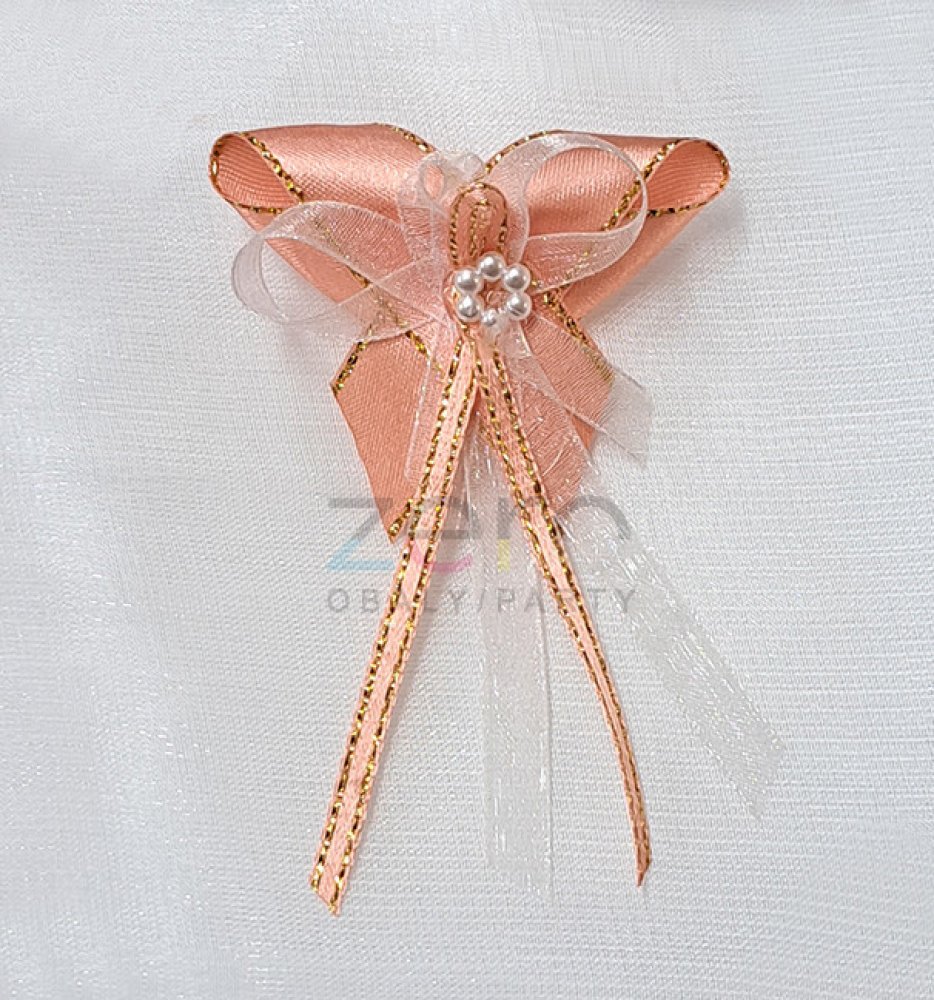 Vonička pro rodiče a svědky o výšce 8 cm. Součástí je i špendlík na přichycení.Barva: lososová se zlatými pruhy atlasová + bílá šifónová a bílým perlovým květem
