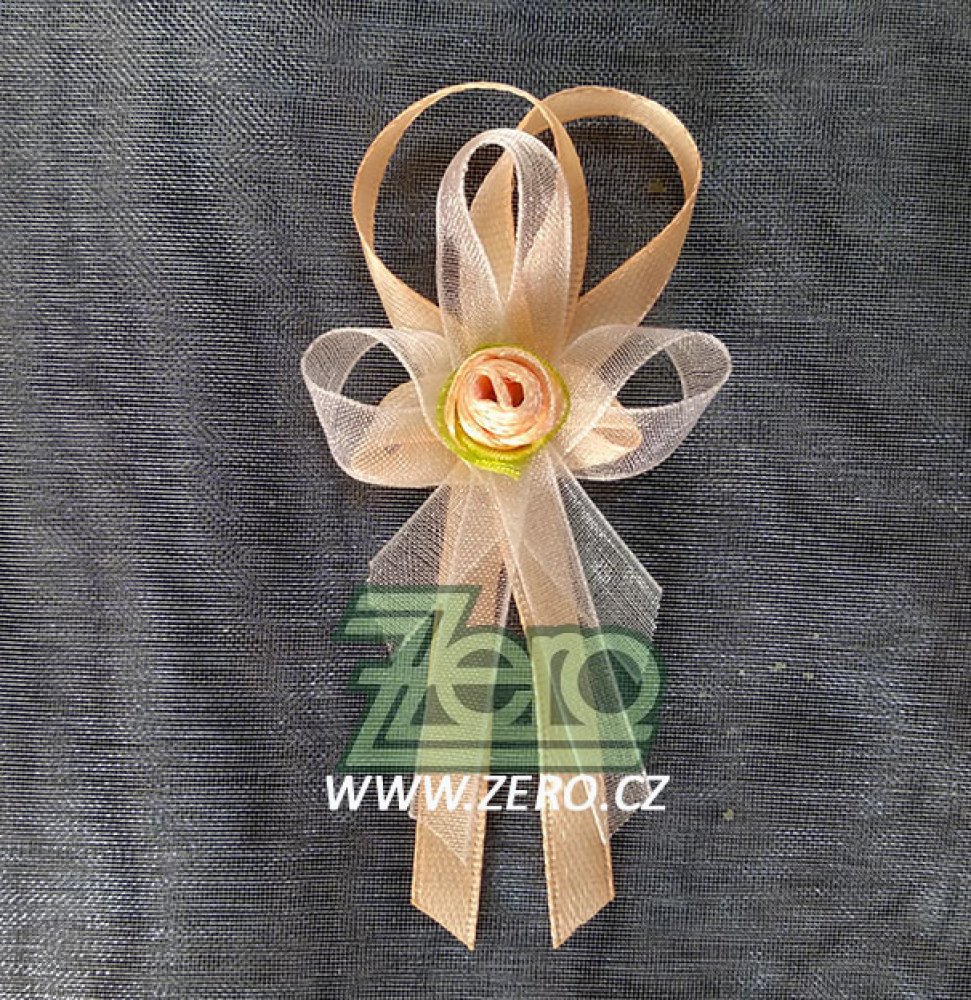 Vonička (vývazek) svatební pro rodiče a svědky o výšce cca 8 cm. Součástí je i špendlík na přichycení. Barva: lososová s bílými průhlednými nožičkami a lososovou středovou řůži s listy