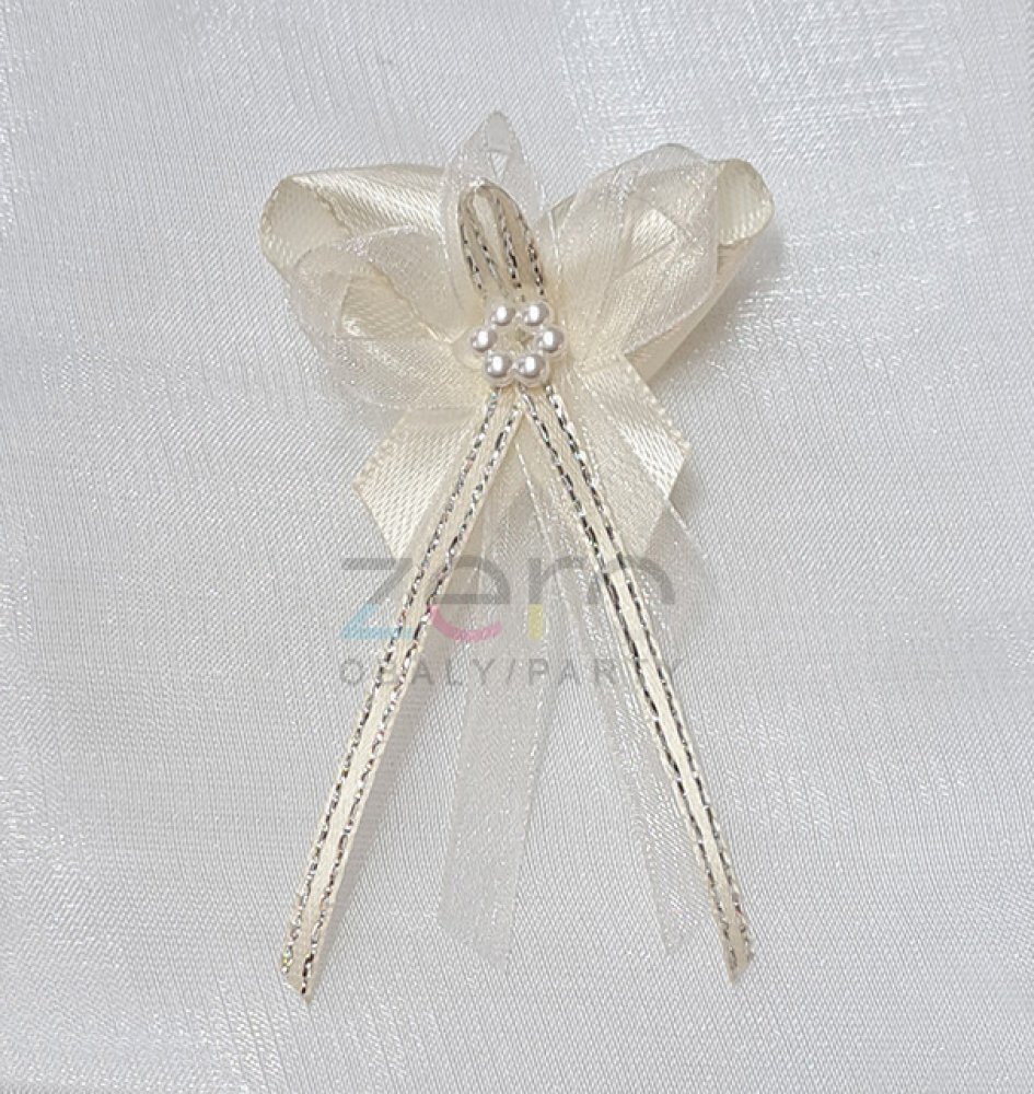 Vonička pro rodiče a svědky o výšce 8 cm. Součástí je i špendlík na přichycení.Barva: slonová kost atlasová + slonová kost se stříbrnými pruhy atlasová + bílá šifónová a bílým perlovým květem