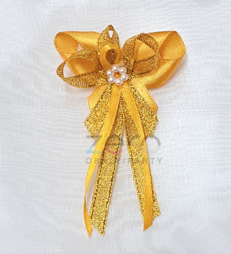 Vonička pro rodiče a svědky o výšce 8 cm. Součástí je i špendlík na přichycení.Barva: tmavě žlutá atlasová + zlatá lurexová s bílým perlovým květem
