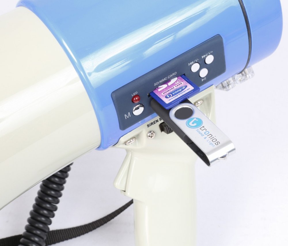 Výkonný megafon s vestavěným 60W zesilovačem s odnímatelným mikrofonem proti zpětné vazbě. Obsahuje sloty USB a SD, funkci sirény, ovládání hlasitosti a nastavitelný ramenní popruh. Vzdálenost 1,0 - 1,2 km v závislosti na provozních podmínkách.