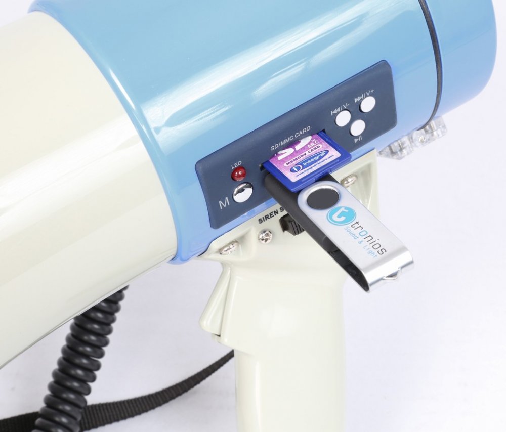 Powerful megaphone with USB port and SD slot, lithium battery, MP3 control panel, built-in 65W amplifier and detachable anti-feedback microphone with coiled lead. Siren function, volume control and adjustable shoulder strap. Distance 1.0 - 1.2km depending on operating conditions.