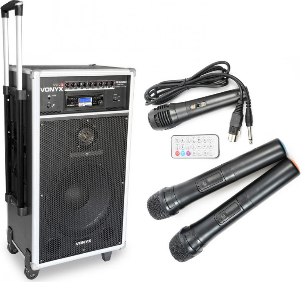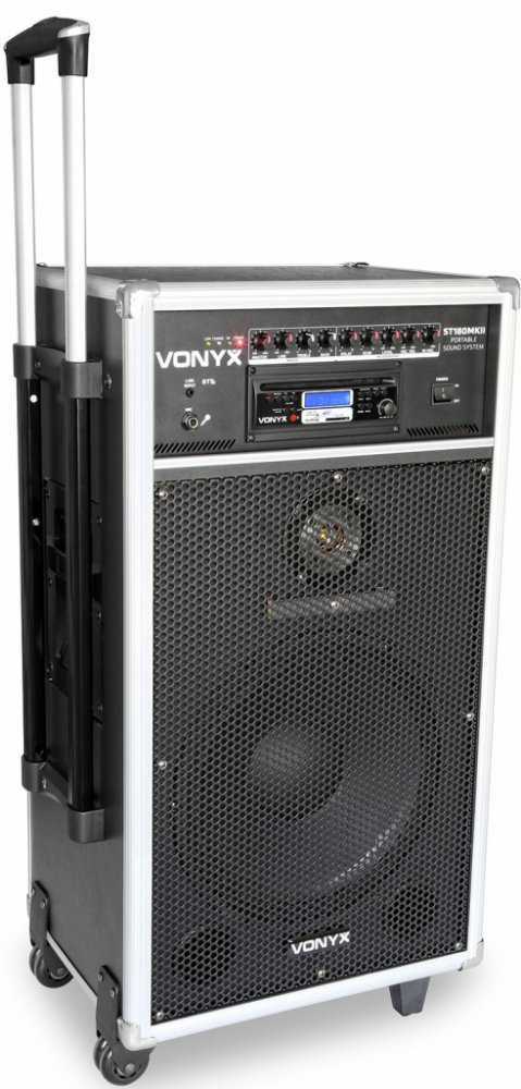 Mobilní 12" zvukový systém se zabudovanou dvojitou dobíjecí baterií. Celkový max. výkon 450W, integrovaný Bluetooth přijímač, CD přehrávač, USB port a SD/MMC slot pro přehrávání MP3 souborů, mikrofonní vstup Jack 6,3 mm a linkový vstup Jack 3,5 mm. Systém je dodáván se dvěma bezdrátovými UHF mikrofony, jedním ručním kabelovým mikrofonem a IR dálkovým ovladačem. Dobíjecí baterie má kapacitu na 4-6 hodin samostatného provozu, konektory pro externí 12V napájení a linkový výstup RCA. Ovládací panel pro MP3 přehrávač s podsvíceným displejem. Samostatné ovládání úrovně signálu pro kabelový i bezdrátové mikrofony, efekty Delay a Echo. Regulace úrovně signálu pro linkový vstup, regulace výstupní hlasitosti Master a standardní 2 pásmové korekce. Zvukový systém je vybaven ochrannými lištami, rohy, mřížkou reproduktorů, teleskopickým madlem a kolečky pro snadný transport a manipulaci. Ideální mobilní zvuk pro školy a školní tělocvičny, taneční kurzy, sportovní studia, karaoke párty, konference, p