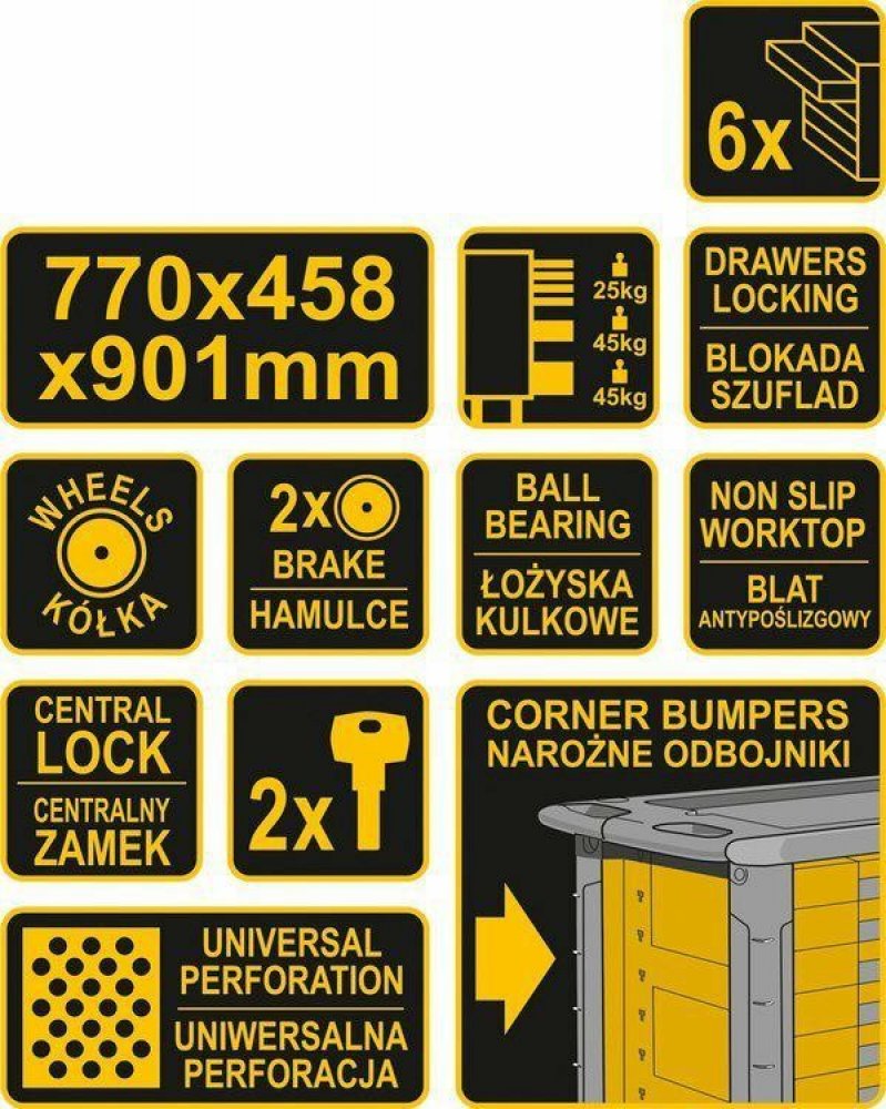 Servisní skříňka má 6 zásuvek na kuličkových vodítkách. Skříň má rohové nárazníky, které chrání před náhodným poškozením, např. karoserii auta. Deska vyrobená z polypropylenu vydrží zatížení 150 kg. 2 spodní zásuvky vydrží zatížení 45 kg. Zbývající čtyři do 25 kg. Výhody: - protiskluzová pracovní deska- centrální zamykání- univerzální perforace- blokování zásuvek- gumová kolečka s brzdou- rohové nárazníky