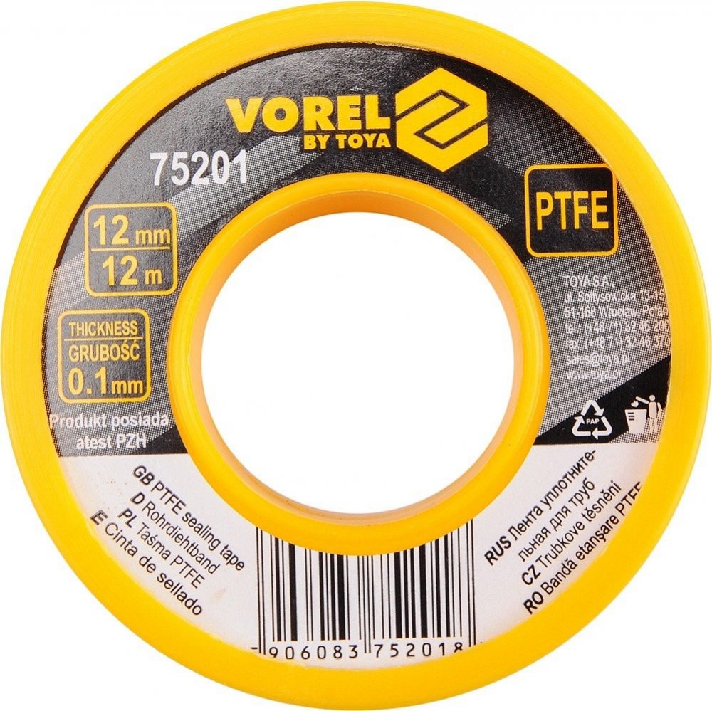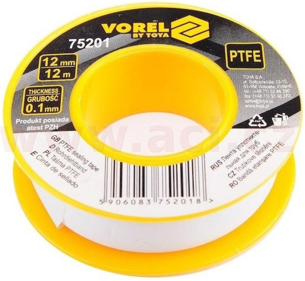 Vorel páska teflonová 12 x 0,1mm 12m TO-75201 Páska teflonová slouží k těsnění závitových spojů a zabraňuje únikům kapalin či plynů. Je vhodná pro použití v instalatérství a průmyslových aplikacích.