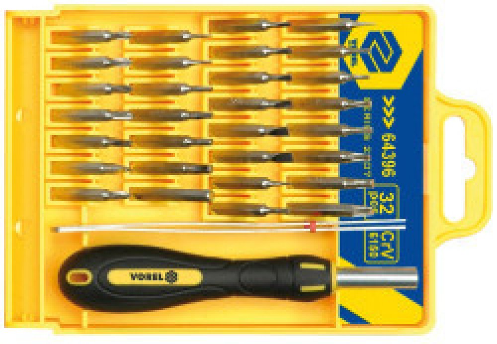 Sada šroubováku a hodinářských bitů. Obsahuje celkem 32ks dílů: nejdrobnější bity různých provedení z kvalitní Cr-V oceli, kvalitní, ergonomický šroubovák a pinzetu. Obsah sady: šroubovák pinzeta bit plochý šroubovák 1,6 2 2,4 3,2 3,6 4 mm bit křížový šroubovák PH000 PH00 PH0 PH1 PH2 bit imbus 0,9 1,6 1,8 2 2,4 3,2 4 mm bit Torx T4 T5 T6 T8 T10 T15 T20 bit tri-wing 3,2 mm bit tamper-proof 2,8 mm bit triangle 3,2 mm bit pěticípá hvězda 2 mm bit čtverec 0,9 mm Konkurenční objednací čísla: 64396 Vorel 64396 Nářadí Vorel