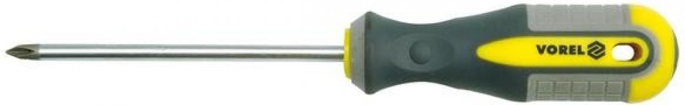 Křížový šroubovák PH0 x 75 mm. Vyrobeno z chrom-vanadiové CrV oceli. Špička má saténový povrch, dodatečně pískovaná a magnetizovaná, což umožňuje pevné uchopení hlavy šroubu. Rukojeť je vyrobena ze dvou kompozitního plastu. Otvor v rukojeti umožňuje zavěsit šroubovák.