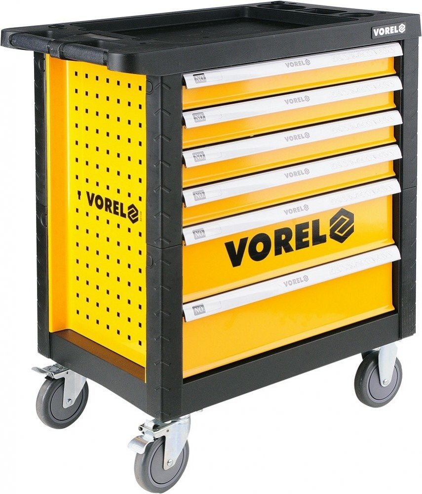 Pojízdná dílenská skříňka vyrobená z kvalitního ocelového plechu, nejen pro profesionální použití. První 4 zásuvky naplněné nářadím, uloženém v plastových organizérech.