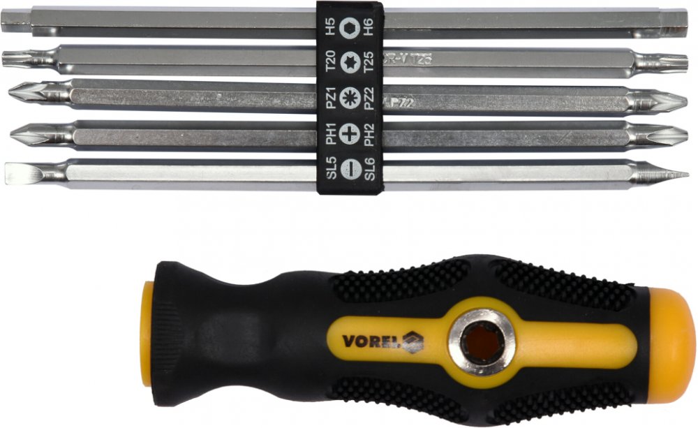 Praktická sada šroubováku s výměnnými, magnetickými nástavci. Tělo šroubováku je zhotoveno z polypropylenu a TPR s ergonomickým tvarováním pro snadnou a pohodlnou práci. Materiál nástavců je odolná CrV ocel 6150. Složení sady: Tělo šroubováku Držák nástavců Křížový nástavec Pz1 a Pz2 Křížový nástavec Ph1 a Ph2 Plochý nástavec Sl5 a Sl6 Torx nástavec T20 a T25 Hex nástavec H5 a H6