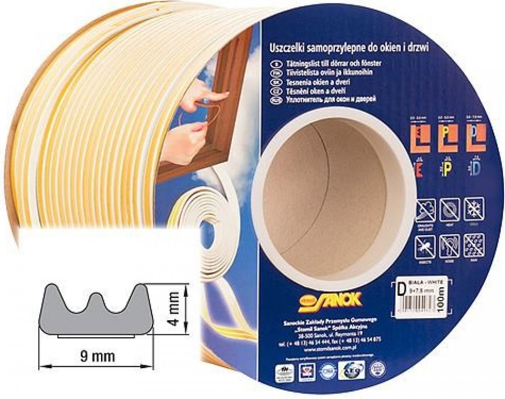 Samolepicí těsnění do oken a dveří, vyrobeno z pryže s elastomerem EPDM, která má velmi dobrou odolnost proti povětrnostním vlivům, UV záření, vlivům vzduchu i vody.