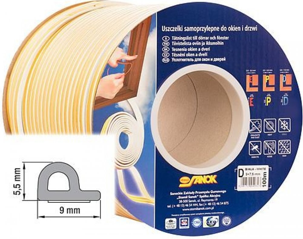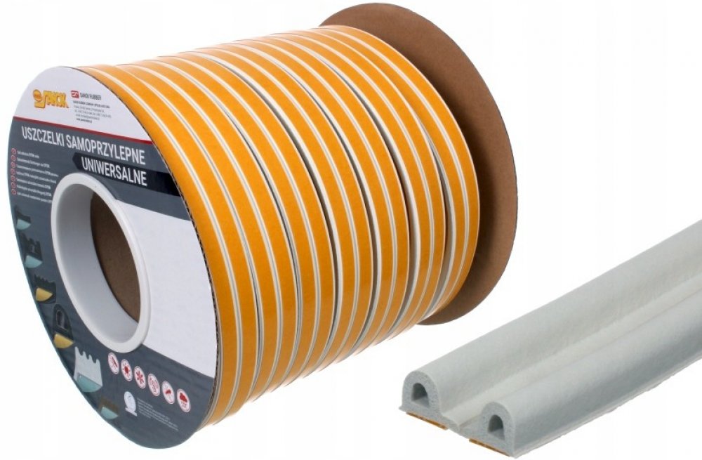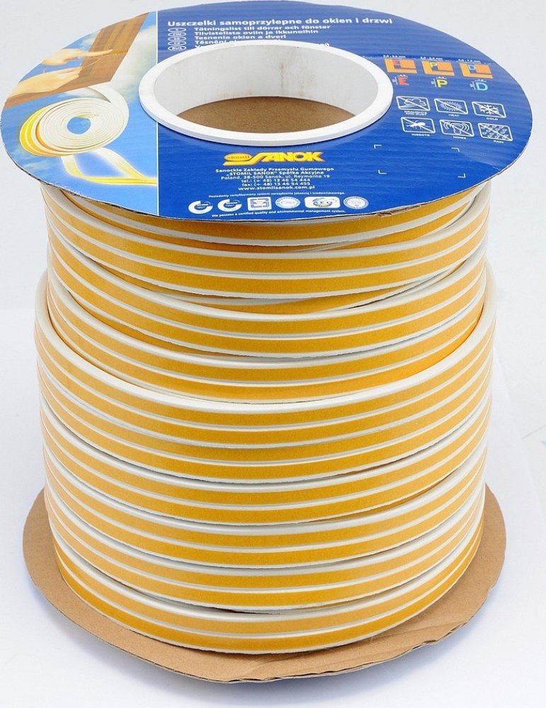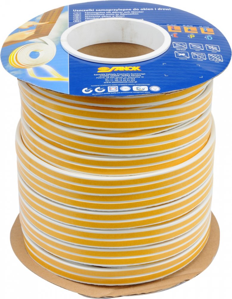 Samolepicí těsnění do oken a dveří, vyrobeno z pryže s elastomerem EPDM, která má velmi dobrou odolnost proti povětrnostním vlivům, UV záření, vlivům vzduchu i vody.