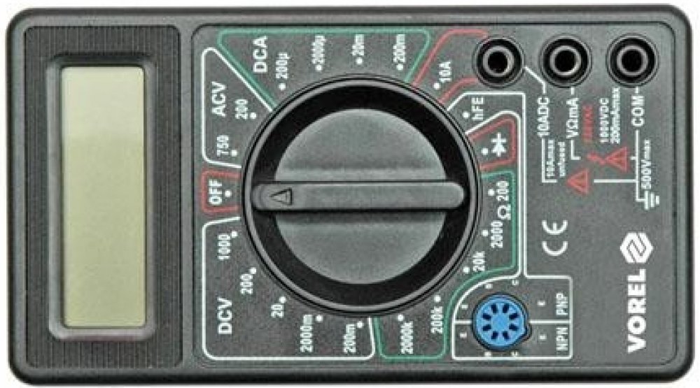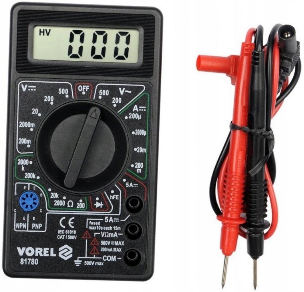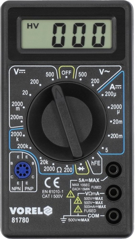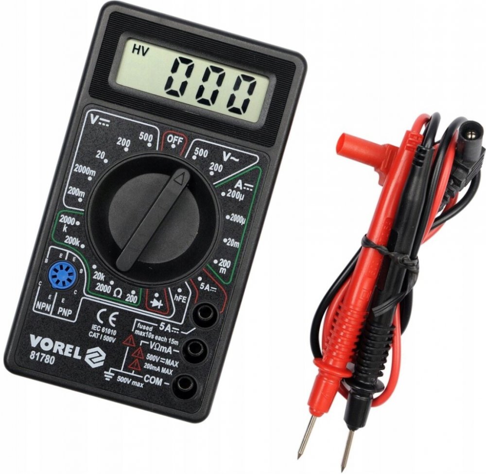 Naměřené hodnoty se zobrazují na přehledném displeji odolného, plastového těla přístroje. K měřiči jsou dále přiloženy kvalitní kabely s měřícími hroty.